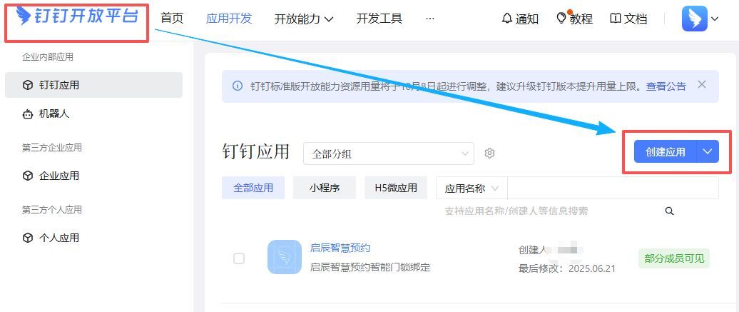 1.进入“钉钉开放平台”,进入应用开发,点击创建应用