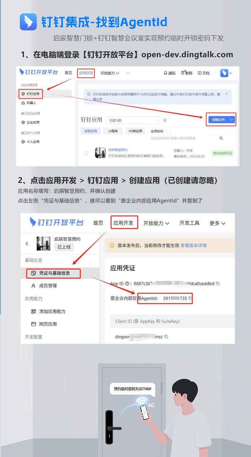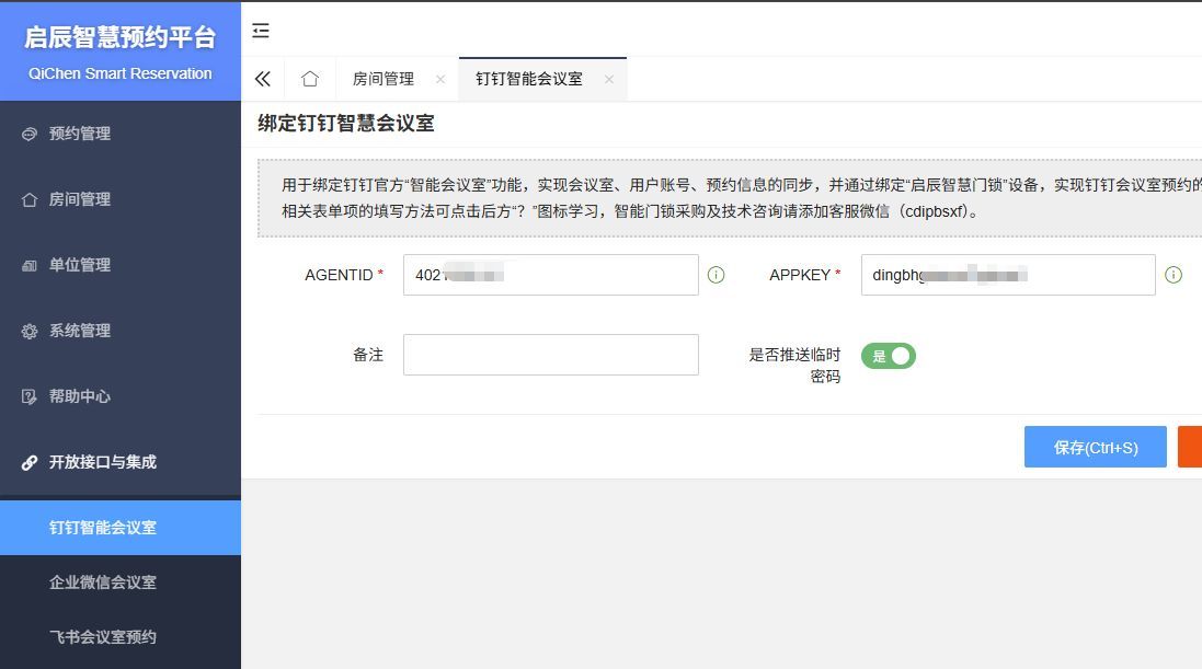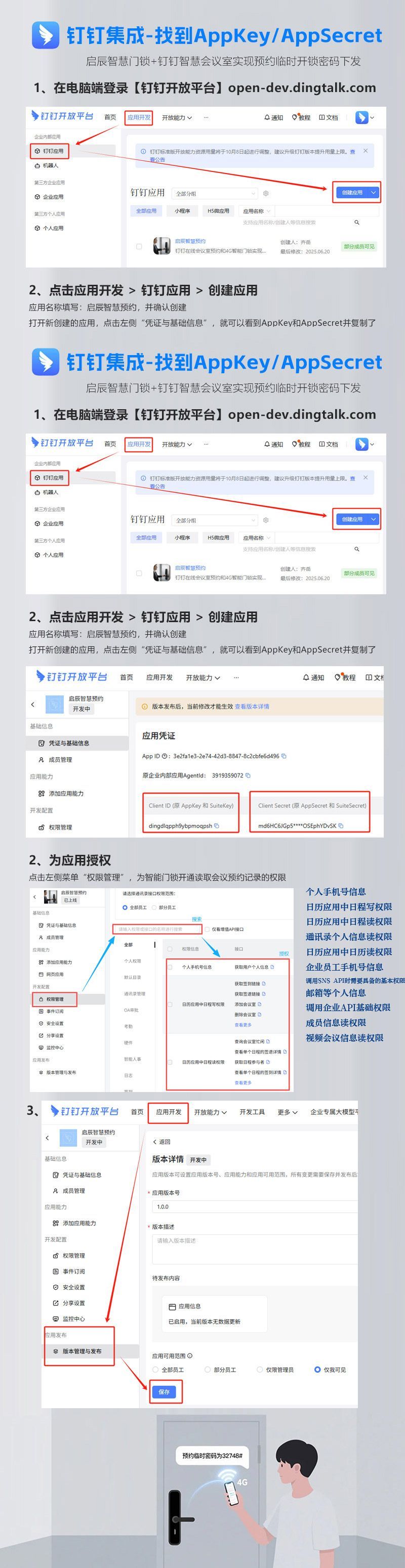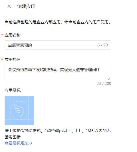这一步是为了让钉钉可以与智能门锁平台(启辰智慧预约)实现对接,将钉钉中的会议室预约(日程)同步给智能门锁,并将智能门锁临时密码通过钉钉应用消息发送给预约人。