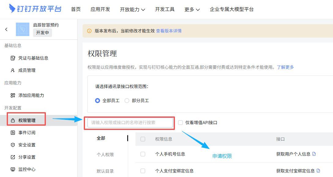 点击刚创建应用的名字,进入应用详细设置,进入“权限管理”,在搜索框中依次输入以下权限并授权。