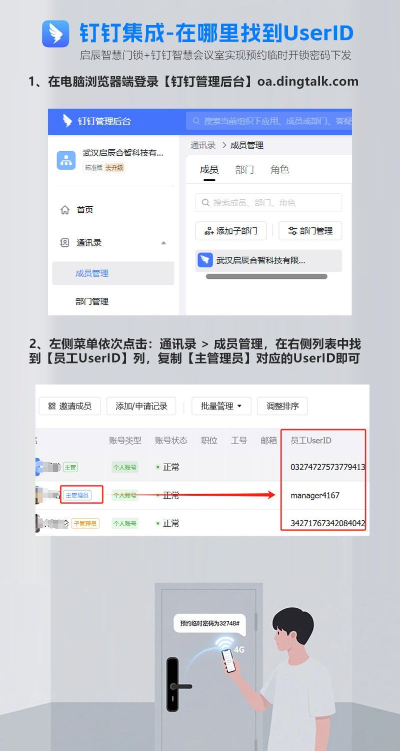 目前很多中小型团队和学校单位都在使用钉钉进行日常办公考勤和流程管理,其中行政综合管理部门的很重要一项工作就是对会议室预约进行管理,传统方式要管理预约台账和钥匙,效率低下且存在钥匙丢失风险,节假日还需要安排值班,本文提出一种新的解决思路,通过钉钉原生的智能会议室应用,结合智能联网门锁,实现在钉钉内预约会议室,自动下发预约时段有效的临时6位数字密码,并通过钉钉消息和钉钉日程可以告知预约人密码的方法。