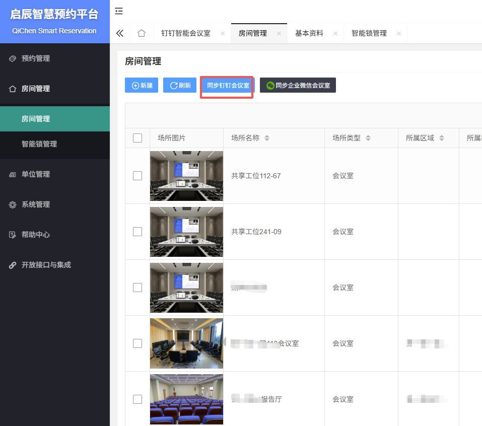 6.回到【启辰智慧预约】管理后台,进入“房间管理”,点击【同步钉钉会议室】即可获得钉钉会议室数据。