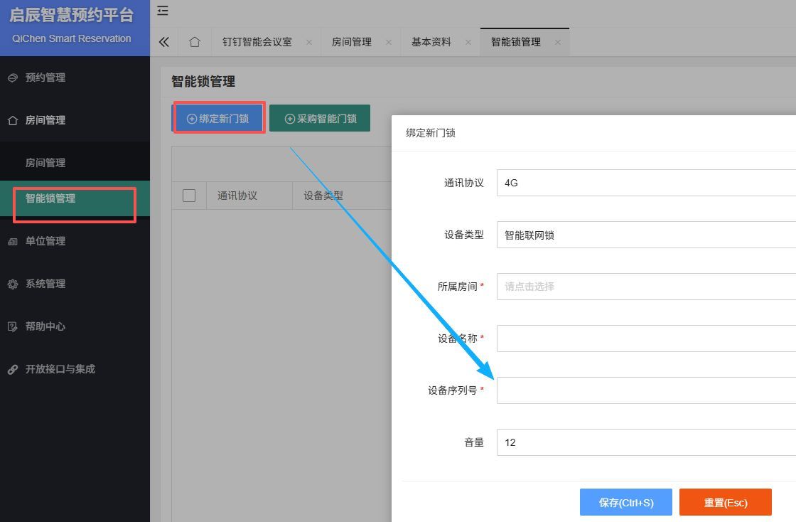 在【启辰智慧预约】管理后台,进入“房间管理-智能锁管理”,将智能门锁上的序列号填入,并选择对应的会议室即可。