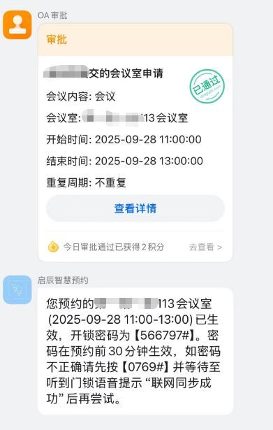 审核通过后,用户可以收到钉钉消息通知并查看临时开门密码,也可以在钉钉日程中查看开门密码。